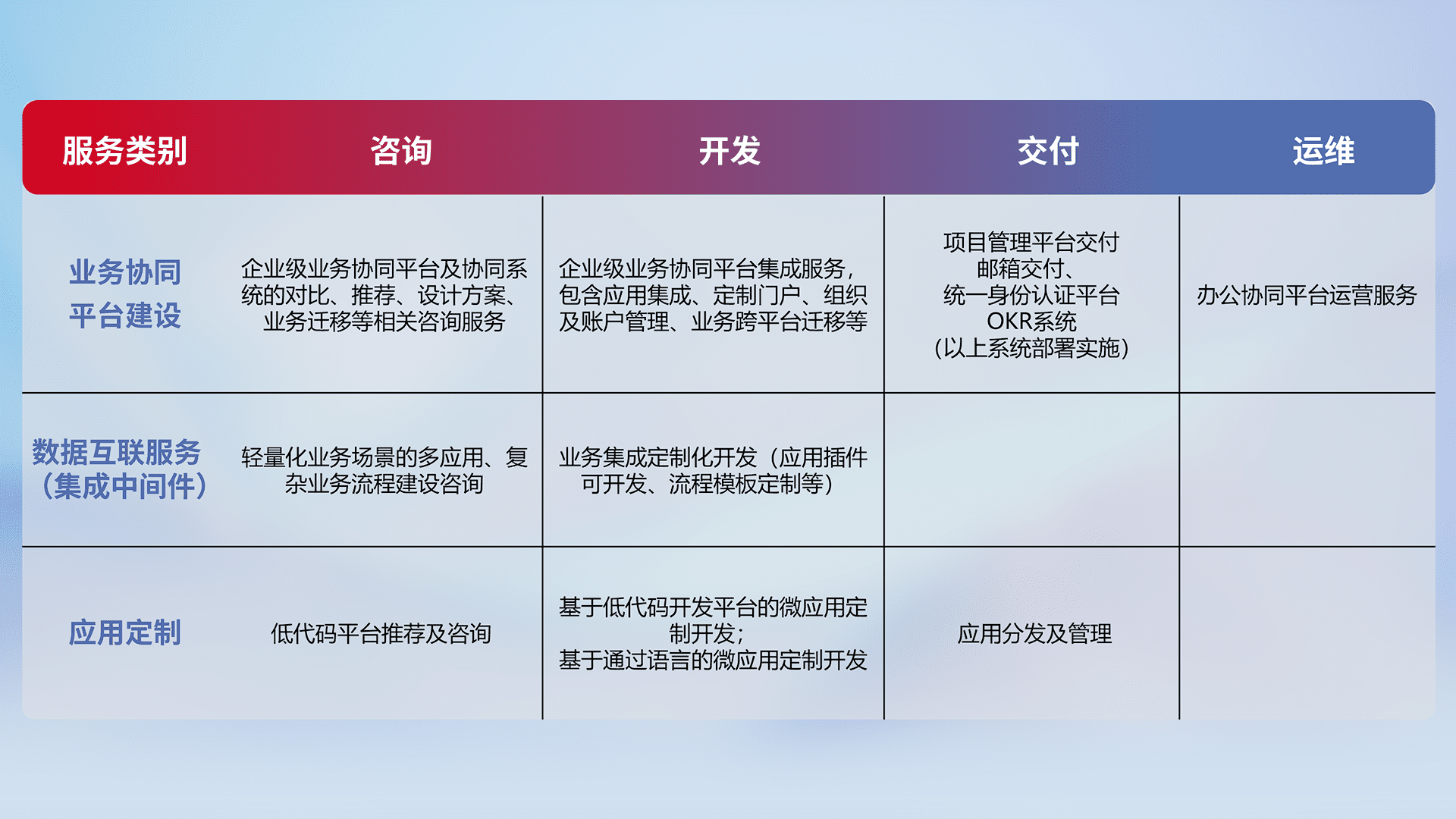 针对钉钉、、企微、、、、IDaas等平台级产品提供产品的规划、、、方案、、交付、、、、定制化开发等服务,,实现如统一协同办公、、智能客户服务、、、混合会议管理、、、智能数据查询、、、等业务场景,,,实现数字化转型。。