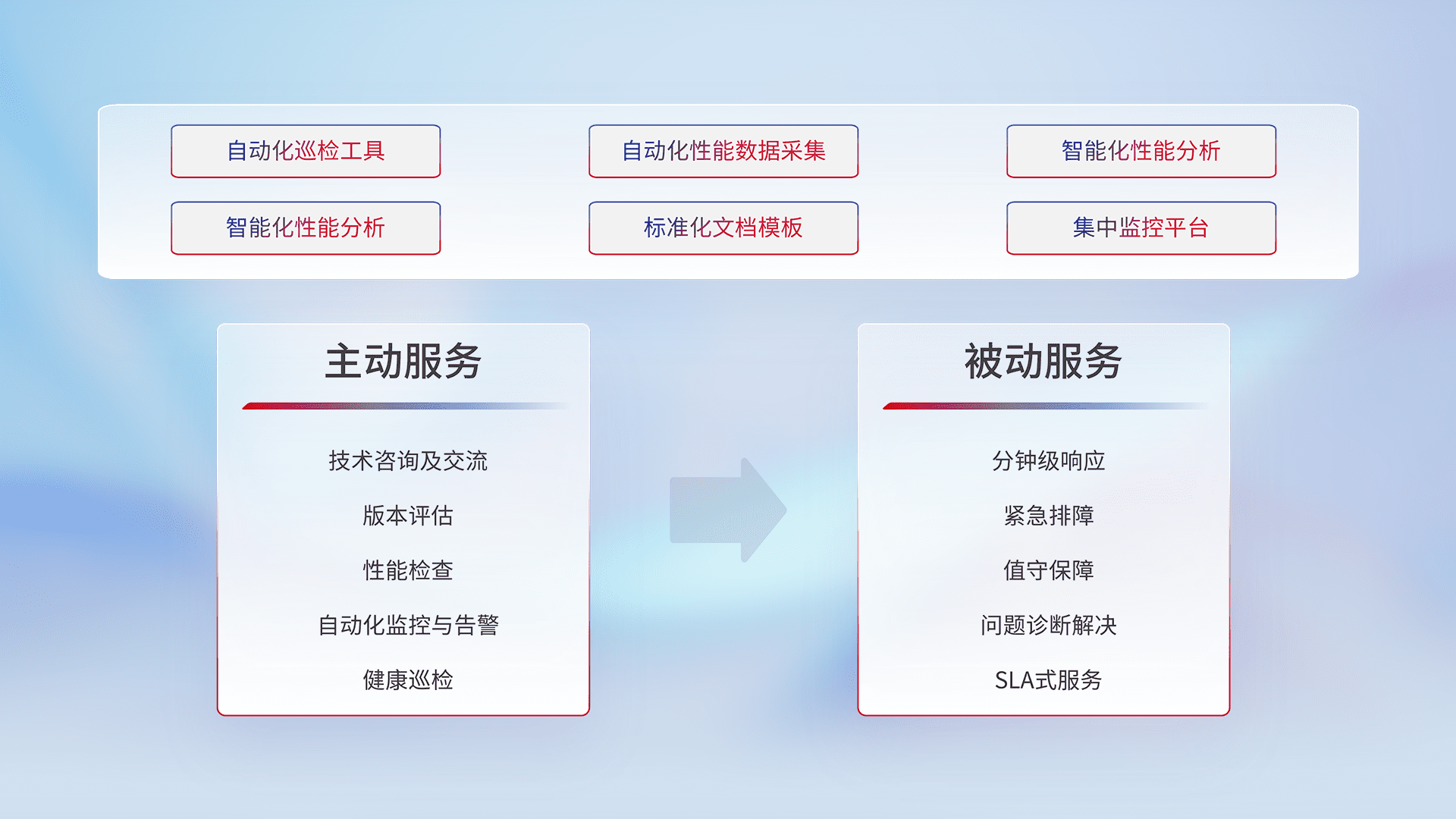 智能化工具和标准化文档,,保障服务质量,,提供主动服务(包含技术咨询、、、、版本评估、、性能检查、、、、自动化监控与告警、、健康巡检)和被动服务包含(分钟级响应、、、紧急排障、、、、值守保障、、、、问题诊断解决、、、、SLA服务)。。。